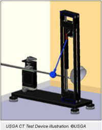 The method of measuring the SPRING LIKE EFFECT in a clubface, recently developed by the USGA is to use a pendulum on the end of which is a metal hemisphere which bounces against the clubface and the contact time relates directly to the SLE. The results of the conformance tests are used in determining conformity of the club head to the Rules of Golf,